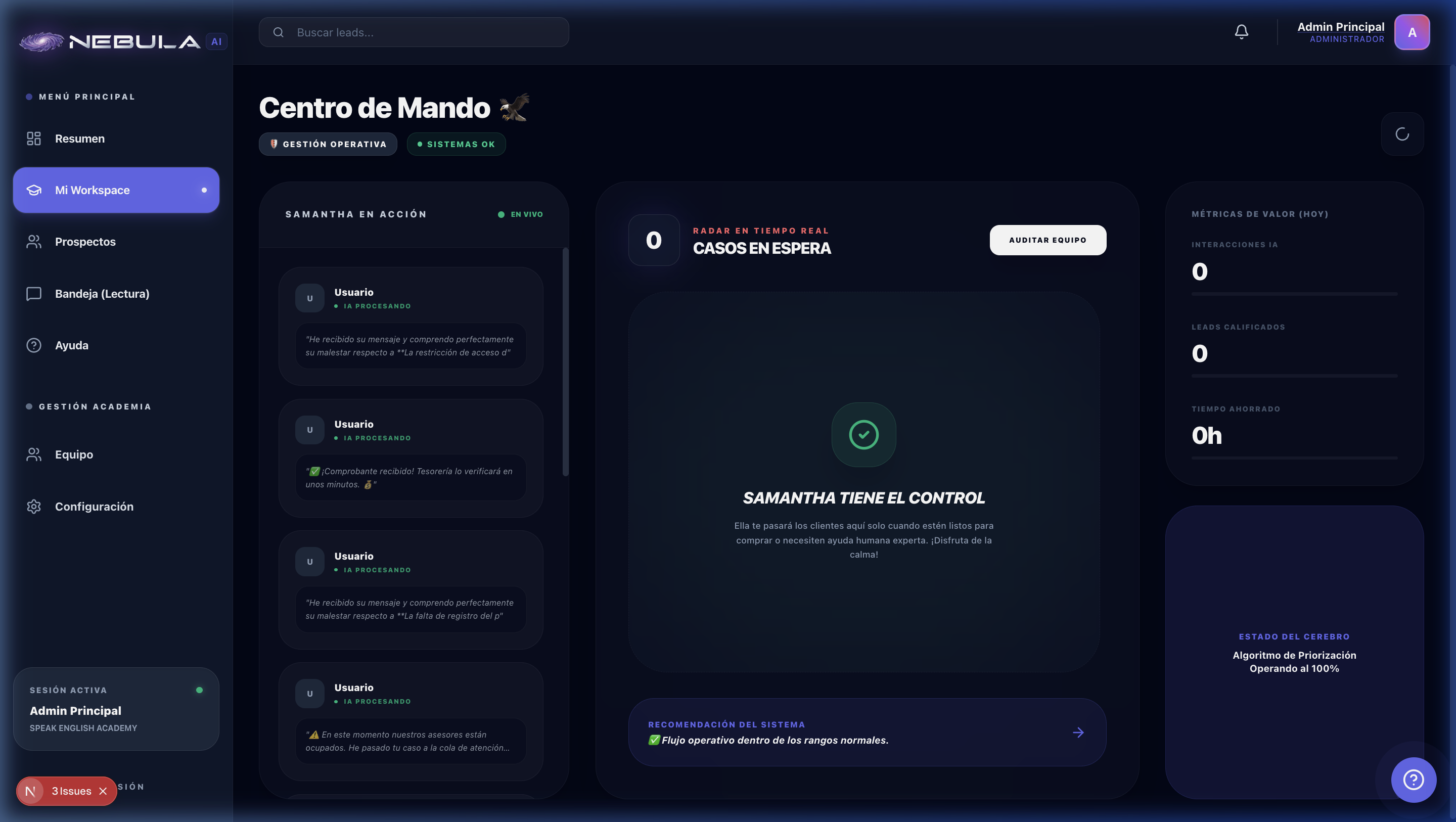 Con nuestro Workspace y Dashboards de alto contraste, tendrás visibilidad absoluta. Observa cómo Nebula califica a los prospectos en vivo ("Samantha en Acción") y decide en qué momento interviene tu equipo de ventas humano.